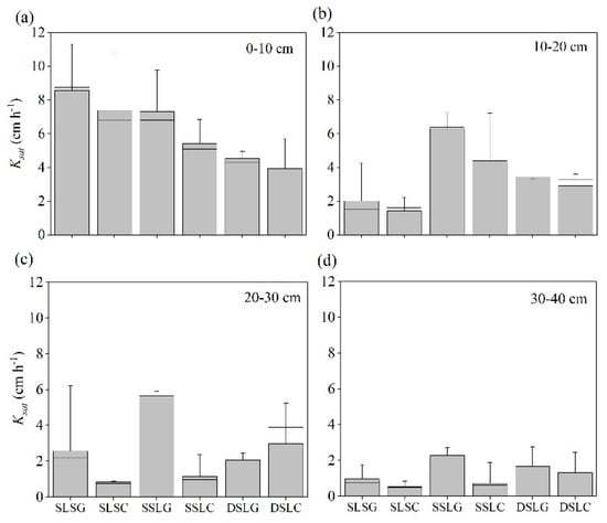 Saturated hydraulic conductivities (Ksat) of different soil architectures at (a) 0–10 cm, (b) 10–20 cm, (c) 20–30 cm, and (d) 30–40 cm. SLSG: shallow loam sandy-shoulder-grassland; SLSC: shallow loam sandy-shoulder-cropland; SSLG: shallow sandy loam-grassland-backslope; SSLC: shallow sandy loam-cropland-backslope; DSLG: deep sandy loam-grassland-footslope; DSLC: deep sandy loam-cropland-footslope.