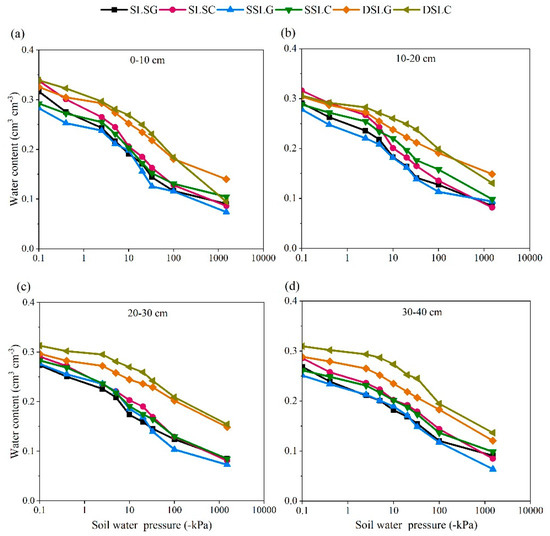 Soil water retention curves under different soil architectures at 0–10 cm (a), 10–20 cm (b), 20–30 cm (c), and 30–40 cm (d) depths. SLSG: shallow loam sandy-shoulder-grassland; SLSC: shallow loam sandy-shoulder-cropland; SSLG: shallow sandy loam-grassland-backslope; SSLC: shallow sandy loam-cropland-backslope; DSLG: deep sandy loam-grassland-footslope; DSLC: deep sandy loam-cropland-footslope.