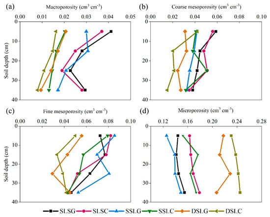 Pore size distributions under different soil architectures: (a) macroporosity, (b) coarse mesoporosity, (c) fine mesoporosity, (d) microporosity. SLSG: shallow loam sandy-shoulder-grassland; SLSC: shallow loam sandy-shoulder-cropland; SSLG: shallow sandy loam-grassland-backslope; SSLC: shallow sandy loam-cropland-backslope; DSLG: deep sandy loam-grassland-footslope; DSLC: deep sandy loam-cropland-footslope.