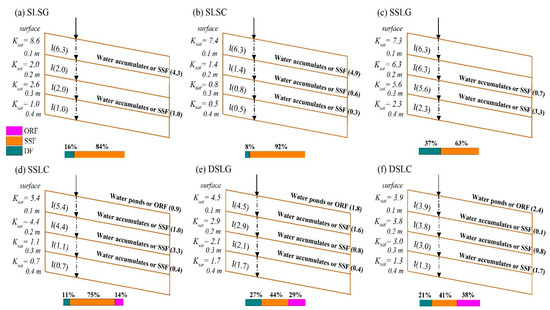 The infiltration of rainfall at the rates of mean I30 of 6.3 cm h−1. The histogram represents the percentage of different runoff pathways under different soil architectures. ORF: overland flow; SSF: subsurface flow; DF: deep-water infiltration. The numbers in the parenthesis are the corresponding flow rates. I is the infiltration that appeared in the soil profile, and the number in the parenthesis is the infiltration rate. Ksat is saturated hydraulic conductivity, cm h−1. SLSG: shallow loam sandy-shoulder-grassland; SLSC: shallow loam sandy-shoulder-cropland; SSLG: shallow sandy loam-grassland-backslope; SSLC: shallow sandy loam-cropland-backslope; DSLG: deep sandy loam-grassland-footslope; DSLC: deep sandy loam-cropland-footslope.