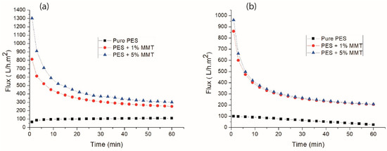- Ferreira, R.S.B.; Pereira, C.H.Ó.; Paz, R.A.; Leite, A.M.D.; Araújo, E.M.; Lira, H.L. Influence of Processing Type in the Morphology of Membranes Obtained from PA6/MMT nanocomposites. Adv. Mater. Sci. Eng. 2014, 2014, 659148. [Google Scholar] [CrossRef]