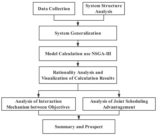 Therefore, in view of the problems in recent studies, based on the Joint Regulation Scheme of the reservoir group in the upper reaches of the Yangtze River in 2018, a giant reservoir group system model including 30 controlled reservoirs that have been constructed, are under construction, or are planned in the upper reaches basin was built. Taking this system as the object, this paper studied the multi-objective joint optimal dispatching problem of a giant reservoir group system with four economic benefits of power generation, ecology, water supply, and shipping on the premise of meeting the flood control requirements. This model will be described in Section 2 and Section 3. After analyzing the rationality of model calculation, this study explores the multi-objective optimal dispatching mode of the reservoir group system in the upper reaches of the Yangtze River, compares the similarities and differences of the multi-objective competition relations under different inflow conditions, and probes into the causes of the interaction of the benefit objectives. The advantages of joint optimal dispatching are also discussed. These analyses mentioned will be shown in Section 4. The results of this study not only increase the comprehensive development benefit of the system on the premise of ensuring the scheduling requirements, but also provides some technical reference and theoretical support for the reservoir dispatching mode in the upper reaches of the Yangtze River to meet the different benefit demands for decision makers. Some suggestions for further study will be shown in Section 5. The research process of this study is shown in Figure 1.