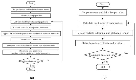 Flow chart of non-dominated sorting genetic algorithm-III (NSGA-III) and particle swarm optimization (PSO). (a) NSGA-III; (b) PSO.