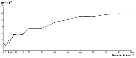 The conception of hyper volume (HV) was used to prove the convergence of the model under the given time of iterations in this study. HV is the only unary measure used to measure the size of the dominant region of a non-dominant solution set [41] and to prove that one set of non-dominant solutions is not inferior to another. In this kind of discrete multi-objective optimization problem, the HV value will gradually maximize and stabilize with the increase of iteration time if and only if the solution set is the Pareto optimal solution [42].