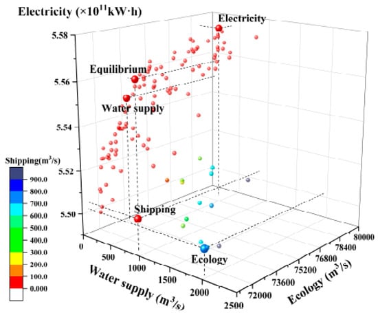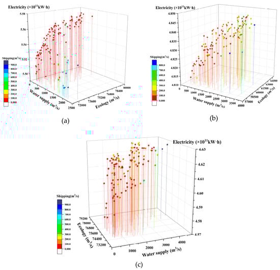 Through the calculation of the model, the multi-objective non-inferior solution sets of the reservoir system in the upper reaches of the Yangtze River under the conditions of wet, normal, and dry water are obtained, respectively (Figure 5). The non-inferior fronts are drawn in the three-dimensional coordinate system in which the three coordinate systems correspond to the objective values of power generation, ecology, and water supply, respectively, and the changes of the shipping target values are represented by color.