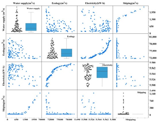 The matrix scatter diagram (Figure 6) also shows that in addition to the above groups of relationships, the pairwise relations between the other groups are scattered on the scatter point diagram. The main reason is that the relationship between these objectives is weak, and the competition for water demand is more complex when the four-dimensional benefit objectives and flood control requirements work together. This will be analyzed in detail in the following parts.