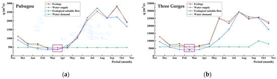 The discharge hydrograph line of Pubugou and the Three Gorges in a partial water supply scheme and partial ecology scheme compared with the ecological and water supply requirements. (a) Pubugou; (b) the Three Gorges.