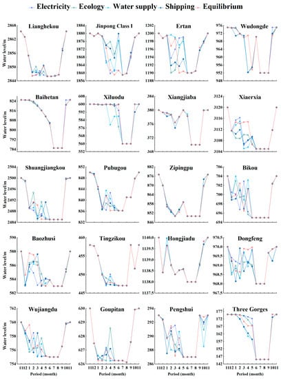 This paper shows the water-level change process of 20 reservoirs in the upper reaches of the Yangtze River when biased toward different benefit objectives in the wet year, together with the equilibrium solution (Figure 9). It can be seen from the diagram that the variation range and amplitude of the water level of each tributary leading the reservoirs in equilibrium solution are large due to the small influence of other reservoir operation modes, but the water-level change of the reservoir in the downstream position is much more stable. In addition, the water-level change of each reservoir in the equilibrium solution is basically kept between the upper and lower outer lines of the range of water-level variation when partial to the single-target solution. The results above, on the one hand, show that the equilibrium solution does play a role in coordinating the benefit objectives and reflects the influence of each objective on reservoir operation in the case of multi-objective comprehensive optimization. On the other hand, it also shows the characteristics of the interaction between the reservoirs in the reservoir system.