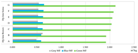 The WF of eggs varies slightly from chicken house A to chicken house G, which can be partly explained from the different consumption levels of the feed and egg production of the two species of chickens. Figure 2 illustrated the green, blue and grey WFs of the eggs coming from the seven houses are different. The green WF accounted for the largest percentage of the total WF, which was consistent with the findings of other studies [,,,]. Eggs laid by Hy-line Brown chickens have a lower WF than that from Hy-line Sonia chickens on average.