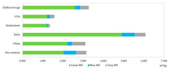Much research in recent years has focused on the WF of animal products due to water assessment of the value chain of animal production, which concentrates on water saving. The high grey WF in swine production leads to environmental pollution [,], and in terms of dairy cows [,] and sheep [,], changing the composition of feed and shifting the production system can reduce the water footprint. It has become clear that livestock and poultry products significantly contribute to water degradation and water scarcity [].