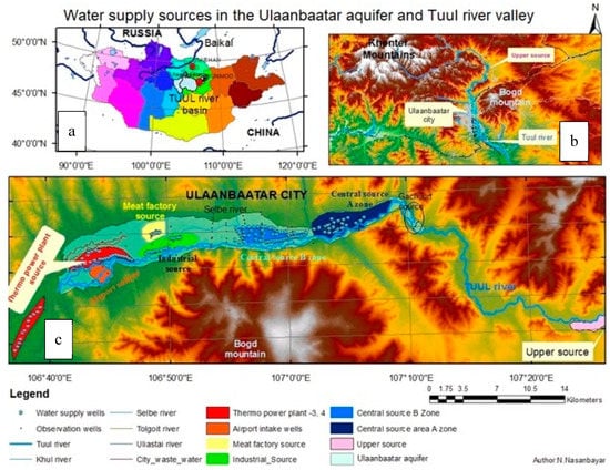 - GIM—Geoecology Institute of Mongolia. The Current Situation, Location, Reserves and Future Concept of Domestic and Industrial Water Supply for Ulaanbaatar City; GIM: Ulaanbaatar, Mongolia, 2000. [Google Scholar]