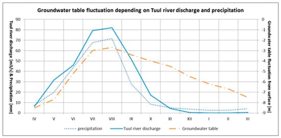 In March and April, the groundwater table of water source aquifers decreases to minimum of 8 to 10 m from the surface, but it reaches maximum level of 2 m under the earth surface in the central area of the source in June, July, and August [], see Figure 2. This table begins from a hydrological year where the wet season begins with melt water from snow and ice after a long, cold winter.