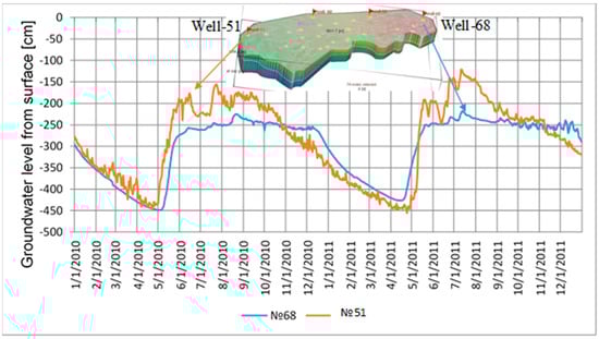 Table of groundwater fluctuation in Wells 51 and 68 in the simulation area.