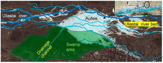 The groundwater flux alongside the river drains through drainage canal-built icing phenomena, while springs’ flow beds are blocked by ice and the main stream in the main riverbed flows under the ice cover. In this section, the Uliastai River gains streams of almost one-third of the flow of the discharge abstracts to groundwater, and groundwater comes from springs.