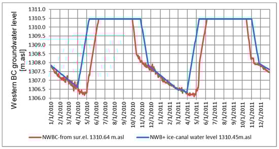 Recharging time difference on northwest boundary (NWBC) with ice storage (blue), only from drainage canal (red).