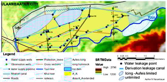 The joint meeting of the Mongolian and Russian mineral resources commissions estimated the useful capacity of groundwater resources of Ulaanbaatar aquifer at 264 × 103 m3/day [], without an upper source in the eastern side of the Ulaanbaatar aquifer (Figure 1), which pump groundwater around from 24 × 103 m3/day to 48 × 103 m3/day from aquifer [].