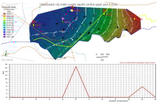 Another alternative simulation scenario is for the water release from the surface water reservoir with a dam, with a constant q rate of 26.6 m3/s and creation of table for constant groundwater water. In this case, the model is taken with the eastern and western boundary using a constant groundwater level and hydraulic head and, also, in the southern boundary as the Tuul River with a constant level value for groundwater recharge. In the FEFLOW simulation, the maximum abstraction rate reached 90,288 m3/day. Following this, the simulation produced an error report indicating that the aquifer has no groundwater; see Figure 8.