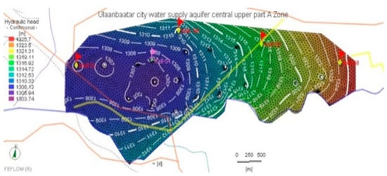 The groundwater simulated contours by a combination of managed aquifer methods and recharge from Tuul River outflowing from reservoir.