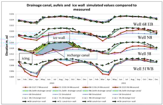 The relation between the estimated quantity of the MATLAB ice code and the FEFLOW simulation characterizes the boundary condition change in the northwest side of simulated area. The groundwater recharge from the river starts in May, when the Tuul River flows again. However, in the simulation, the aufeis-stored ice was shown to melt earlier in April and to recharge groundwater. The aufeis changes the northwest boundary condition so that the recharge starts from the beginning of April. The drainage canal begins to flow with water from May, when the Tuul River flows again; see Figure 6. The eastern boundary groundwater fluctuation taken from Well 68 was not found to change. However, the downwards flow direction of the northwest boundary condition was found to change with recharge from the ice melt water; see Figure 6, blue line.