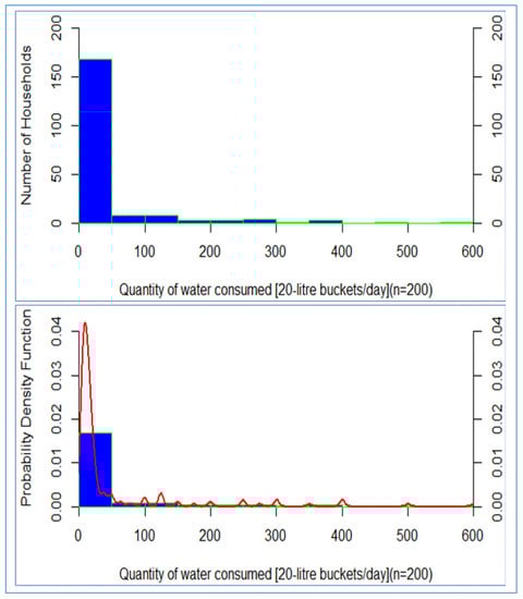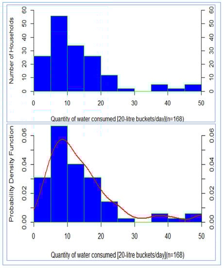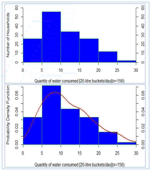 Since skewness is still far greater than 0, calculating upward and downward error was carried out again using n = 168, where Q1 − 1.5(IQR) was −6.5, Q3 + 1.5(IQR) was 30, and the skewness coefficient was 0.66. Therefore, all the groundwater consumption figures above 30 were termed as outliers, and thus trimmed from the groundwater exploitation analysis. The sample size was therefore reduced to n = 156, with the maximum data point in the groundwater consumption dataset being 30 20 liter-buckets/day. This analysis was used for estimating household consumption of groundwater in the Dar es Salaam aquifer because the skewness of 0.66 suggested that the groundwater exploitation data at n = 156 were close to being symmetrical as shown in Figure 5. Table 4 shows the statistical variables (i.e., mean, median, mode, standard deviation, minimum and maximum) of groundwater consumption data for n = 156.