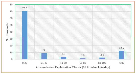 After outlier analysis, it was found that groundwater exploitation data have a big upward error for n = 200 (Table 1), which was 586. Therefore, the consumption parameters generated using n = 200 to compute groundwater exploitation could be misleading. Equally important, skewness for n = 200 was found to be 3.4 (Table 2), which corresponds to the observed large upward error. This indicates that the data are extremely skewed to the right (Figure 2), and thus the use of mean or median for computing groundwater exploitation is highly unrealistic. In addition, the percentile analysis as shown in Table 3 shows that for slightly over 70% of the dataset, the maximum quantity was 25 20-liter buckets per day (approximately 500 L/day), indicating that the dataset has a very large upward error as depicted in Table 1. This suggests a need for dataset adjustment using bias correction statistical methods. Figure 3 shows the classes of groundwater exploitation, with the largest consumption being from 0–20 20-liter buckets per day, which is approximately 70% of the sampled households in the study area. This is equally an indication that the data is skewed to the right since the class consuming 101 to 600 20-liter buckets per day makes only 12.5% of the households.