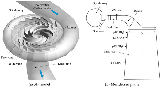 (a) 3D model and (b) meridional plane of the pump-turbine.