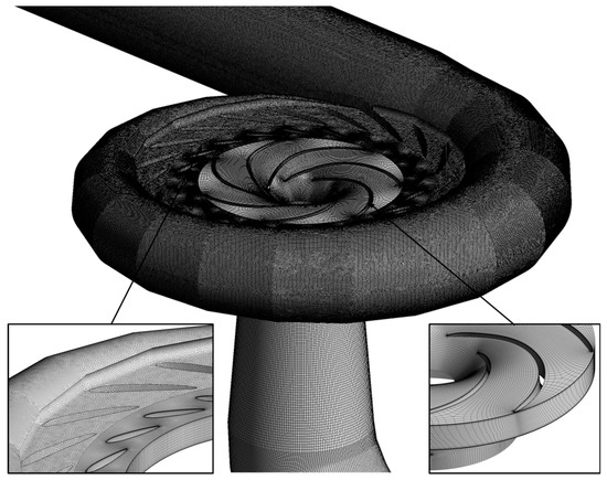 As the boundary conditions, the total pressure and static pressure were set accounting for the water level of the upper and lower reservoirs in the turbine mode at the pump-turbine’s inlet and outlet, respectively. The SST turbulence model was used, which is suitable for precise predictions of the flow separation in an adverse pressure gradient [20,21]. This model employs k-ω and k-ε models according to the distance from the wall respectively, and the blending function between these two models ensures the smooth transitions [17]. For the steady-state analyses, stage boundary conditions were applied to connect the surfaces between the stationary and rotating domains; for the unsteady-state analyses, transient-rotor-stator boundary conditions were applied. In order to improve convergence and decrease the computational time of the unsteady-state analyses, the steady-state analysis results were used as the initial value. The resolution during the unsteady-state analysis was the runner revolution of 3° per time step. Widmer et al. [1] found good agreement regarding local vortex formation, pressure distribution, and width and frequency of the rotating stall at resolutions between 1° and 5° per time step. Therefore, in this study, the time step was set to 0.001389 s, with a total time of 0.8335 s, and the unsteady-state analysis was performed over a total of five revolutions of the runner. To improve convergence, the number of iterations as the loops coefficient was set to five.