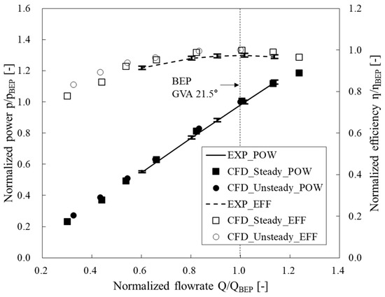 To validate the numerical analysis results, Figure 5 compares the steady- and unsteady-state RANS analysis results with the experimental results. The experimental results of the performance test were provided from the real site which is one of the hydro power plants of Korea; and the uncertainty for the power and efficiency were ±1.14% and 0.91%, respectively, as shown in Figure 5 [22]. In the performance curves, POW and EFF indicate the power and efficiency, respectively. The power, efficiency and flow rate related to the validation were normalized by the corresponding values of the BEF from the unsteady state analysis results, respectively. The efficiency and power were calculated by Equations (5) and (6).