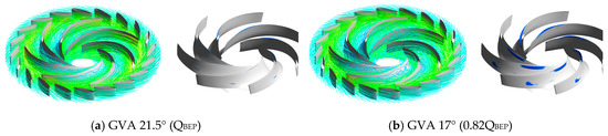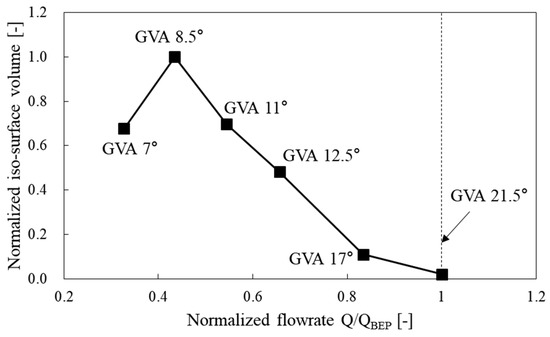 Figure 6 shows the internal flow characteristics of runner blades with streamline and iso-surface distributions, which are the time-averaged values of the velocities from the unsteady-state analyses. The velocity in the streamline was normalized by the maximum velocity (80 m/s) of the entire domain. The iso-surface distributions show lower-velocity regions as about 5% of the maximum velocity that can be regarded as a flow stagnation region. Figure 6a shows the BEP condition, characterized by the smooth internal flow along the runner passage, with no developing vortices or flow stagnation regions. In contrast, Figure 6b–f show that vortices were gradually generated in the runner passages as the flow rate decreased, and these vortices caused the flow stagnation regions shown in the iso-surface distributions. Furthermore, more flow stagnation regions due to the vortices in the runner passages developed from the hub to the mid-span than near the shroud span. The volumes of the iso-surface as the stagnation regions (Figure 6) were compared as shown in Figure 7. The normalized volume (stagnation region) was increased gradually as the GVA decreased; however, the area was decreased from the GVA of 7°. It can be seen that the stagnation region induced by the inter-blade vortex was formed near leading edge at the GVA of 7°, therefore the stagnation region was formed in the runner passages relatively smaller than the GVA of 8.5°; this reason can be seen the difference of incidence angle (Figure 8).