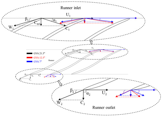 Velocity triangles at runner inlet and outlet with GVAs of 21.5°, 12.5°, and 7°.