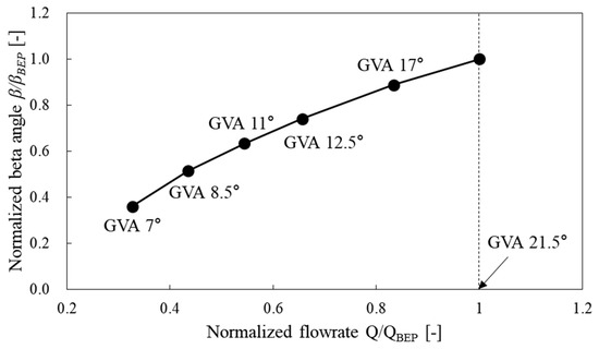 In order to indicate the characteristics of the flow incidence angle according to the flow rate, Figure 9 shows the beta angle distributions at the runner inlet according to the GVAs as the different flow rate conditions. The beta angles were varied with each GVA as the flow rate changed. Therefore, the flow characteristics were influenced by changing the incidence angle between the blade and flow angle according to the GVAs as compared in Figure 8.