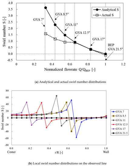 where, and are the axial flow velocity for observed and swirl-free conditions, respectively. and are the discharge factors from Equation (10) for observed and swirl-free conditions, respectively. The theoretical swirl-free condition represents the case in which the flow at the runner outlet is axial, and in this study, the BEP condition was considered as the swirl-free condition. Figure 11 shows the comparisons of the analytical and actual swirl number distributions for each flow rate condition using Equations (7) and (9), respectively and comparisons of the swirl number distributions using Equation (8) on the observed line in the draft tube as shown in Figure 4. As can be seen in Figure 11a, the both analytical and actual swirl number distributions increased maximally to 3.64 and 1.59, respectively, at a GVA 7°. In addition, the actual swirl numbers show the similar tendency with the analytical numbers when GVA is higher than 12.5°. However, when the GVA is lower than 12.5°, the actual swirl numbers show different tendency with the analytical swirl numbers. The analytical swirl numbers are tending toward +∞ when the flow rate is becoming zero, which is lack of physical phenomenon. The difference between the analytical and actual results can be seen by the flow separation in the runner passages with changed relative flow angle at the runner outlet [29]. Previously, Favrel et al. [29] observed similar swirl number distributions between the analytical and experimental results. In the Figure 11b, the local swirl number distributions are shown with various GVAs on the observed line (marked in Figure 4) from center to the wall in the draft tube. There are large discrepancies between the swirl number distributions in Figure 11a and on the lines in Figure 11b. It can be seen that the analytical and actual swirl numbers were averaged by the passage area and then calculated, while the swirl numbers on the line were calculated by the local values. Therefore the local results can be shown with a lager values. The difference between the maximum and minimum values of the swirl number was increased gradually and their differences were moved from center to wall of the draft tube, as the GVAs decreased. It can be confirmed with the absolute flow angle at the outlet of runner as shown in Figure 8; as the absolute flow angle decreased (as the GVA decreased), higher swirl characteristics also were moved toward the draft tube wall.