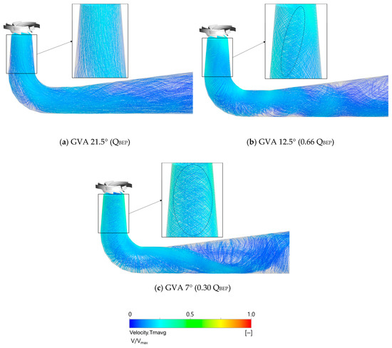This study confirmed that the inter-blade vortex characteristics in the runner passages depend on the flow rate conditions and velocity components at the runner inlet, and the vortex rope characteristics in the draft tube occur in specific flow rate ranges and velocity conditions at the outlet of runner. The flow and velocity characteristics at the outlet of runner are influenced from the internal flow characteristics in the runner passages as shown in Figure 11 and Figure 14, and to investigate the correlation of the inter-blade vortex and vortex rope, Figure 18 compares the iso-surface and 3D streamline flow distributions from the runner passages to the draft tube during the one runner revolution with GVAs of 12.5° and 7°. Here, the iso-surface is the flow stagnation region shown in Figure 6. With the GVA of 12.5°, the flow stagnation regions occurred in the runner passages; irregular flow and flow stagnation regions occurred at the runner outlet; and these flows were connected with the top of vortex rope in the draft tube. With the GVA of 7°, the flow stagnation regions developed in the runner passages, with complicated flow; however, the vortex rope was not developed visibly. Although the swirl intensity increased as the flow rate decreased at the runner outlet, when an inter-blade vortex developed in the middle of the runner passage, within the specific range of low flow rates (0.82 QBEP–0.44 QBEP), the internal flow in the runner passage affected the flow angle distribution and the swirl characteristics at the runner outlet and in the draft tube, as shown in Figure 11 and Figure 14, resulting in the visible development of the vortex rope.