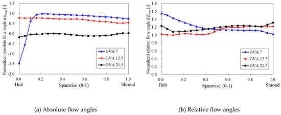 Distributions of (a) absolute and (b) relative flow angles along the spanwise direction at the runner outlet with GVAs of 21.5°, 12.5°, and 7°.