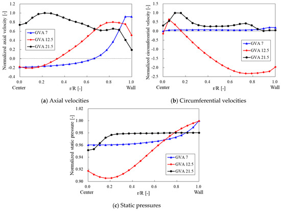 Figure 15 compares the time-averaged axial, circumferential velocity and static pressure distributions along the line from the draft tube’s center point to the wall at the height of the measuring point p3 shown in Figure 4. The abscissa represents the measurement location relative to the radius from the center (0) to the wall (1) of the draft tube, and the values of velocities and pressures were normalized by the maximum value. The GVA of 21.5° shows a relatively even axial velocity distribution for the BEP condition, whereas backflows are shown near the center of the draft tube with GVAs of 12.5° and 7° as shown in Figure 15a. In particular, the backflow showed a wider range from the center to approximately r/R = 0.65 with the GVA of 7°, which had the highest swirl intensity, relative to the GVA of 12.5°, which showed the large vortex rope. In Figure 15b, the circumferential velocity distributions appear relatively lower, at close to zero, with the GVAs of 21.5° and 7° that did not show the vortex rope, whereas a large circumferential velocity appears over a wider range, with the GVA of 12.5°. In addition, in the Figure 15c, the pressure with GVA of 12.5° shows relative lower at near center, which location showed the development of the vortex rope. These results show the influence of revolution with precession on the development of the vortex rope. Thus, the axial velocity results show that the backflow that adversely affected the smooth flow and performance in the draft tube occurred, not only in the specific flow rate range in which the vortex rope developed but also in the low flow rate region with the strongest swirl intensity and very complicated flow.