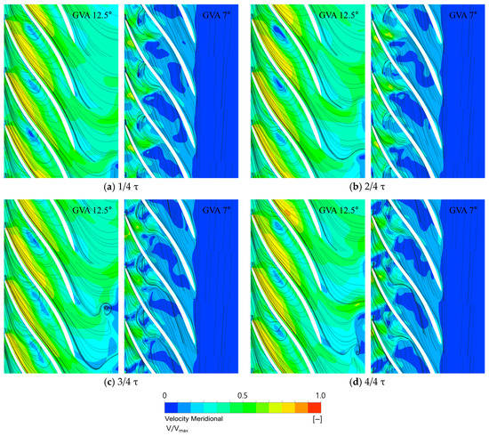 Meridional velocity distributions on the hub span of the runner with GVAs of 12.5° (left) and 7° (right) during one revolution of the runner: (a) 1/4 τ, (b) 2/4 τ, (c) 3/4 τ, and (d) 4/4 τ.