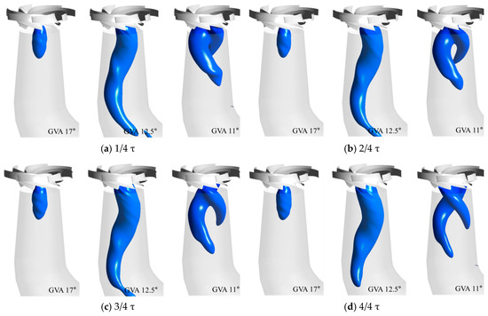 Iso-surface distributions of vortex rope with GVAs of 17° (left), 12.5° (middle), and 11° (right) during one runner revolution: (a) 1/4 τ, (b) 2/4 τ, (c) 3/4 τ, and (d) 4/4 τ in the draft tube.