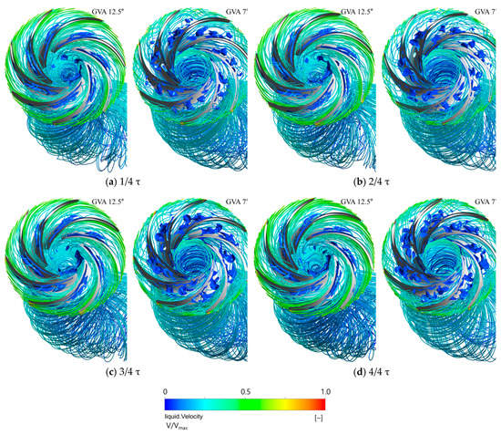 Iso-surface and 3D streamline flow distributions in the runner passages and draft tube with GVAs of 12.5° (left) and 7° (right) during one runner revolution: (a) 1/4 τ, (b) 2/4 τ, (c) 3/4 τ, and (d) 4/4 τ.