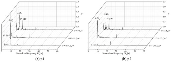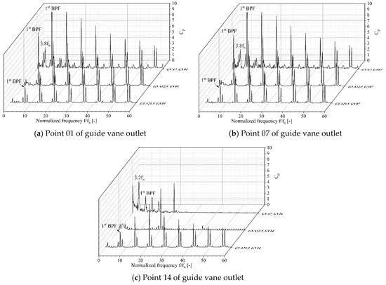 Figure 19 shows the unsteady pressure characteristics obtained via fast Fourier transformation (FFT) analysis with GVAs of 21.5°, 12.5°, and 7° at measuring points 01, 07, and 14 on the outlet of guide vane outlet, indicated in Figure 4. The pressure fluctuation was normalized by the Equation (11) to compare all operating conditions, and the frequency was normalized by the rotational frequency (fn) of the pump-turbine.