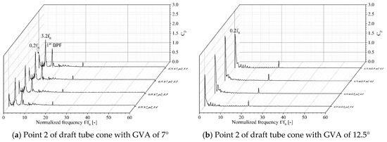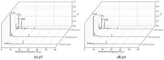 In order to indicate the unsteady pressure characteristics along the flow direction in the draft tube, Figure 21 compares the unsteady pressures that occurred with GVAs of 21.5°, 12.5°, and 7°, at the measuring points of p1 through p4 at the location L1 indicated in Figure 4. The pressure fluctuation and frequency values were normalized using the same methods as for the data shown in Figure 19. In Figure 21a, a high pressure characteristic is shown at the first BEP with the GVA of 21.5°, whereas relatively high pressure characteristics in the low-frequency region of 0.4 fn and 3.2 fn are shown with the GVAs of 12.5° and 7°, respectively. In particular, the relatively dominant pressure characteristic was shown in the lowest-frequency region of 0.2 to 0.4 fn with the GVA of 12.5°, which had the largest vortex rope. In Figure 21b–d, as the measuring point moved in the flow direction, the unsteady pressure characteristics decreased gradually, showing similar trends to the GVAs of 21.5° and 7°. However, with the GVA of 12.5° that had the largest vortex rope, the pressure characteristic decreased from point p4 after increasing until point p3. This result occurred because as the vortex rope developed and rotated, it became larger closest to point p3, and the unsteady pressures decreased as the size of vortex rope decreased and moved away from the draft tube wall along the flow direction. Therefore, despite the highest swirl intensity shown with the GVA of 7°, the relatively dominant unsteady pressure characteristics were shown in the low-frequency region induced by the largest vortex rope with the GVA of 12.5°.