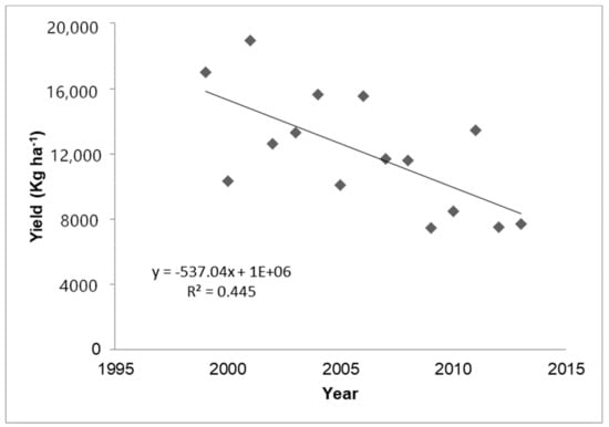 Yield trend for 15 years of the Barnea olive variety grown in the Revivim orchard.
