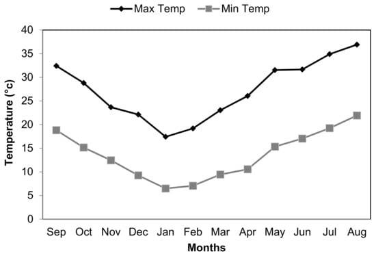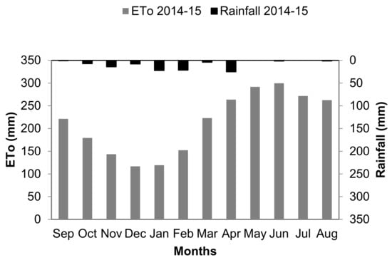 A field investigation was carried out in the olive (Olea europaea) cultivar ‘Barnea’ orchard of Kibbutz Revivim (31.0436° N, 34.7212° E), located in the central Negev Desert, Israel. The climatic conditions of the location are of the typical arid type, with cooler night temperatures and hot, dry summers (Figure 2). The mean annual rainfall ranges from 75 to 125 mm []. During the 2014/2015 season, the total precipitation was 105 mm and cumulative potential evapotranspiration was 2500 mm (Figure 3). The olive orchard was planted in 1995 and has been irrigated with brackish groundwater (EC = 4.4 dS m−1) since then, for approximately 20 years. Water quality parameters of the brackish irrigation water are presented in Table 1.