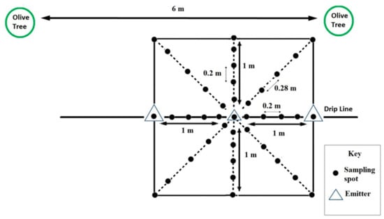 Schematic view of soil sampling spots in an olive orchard under sub surface drip irrigation.
