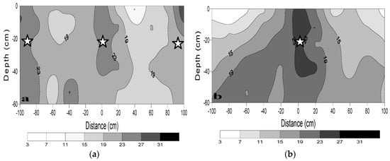 Gravimetric water content (%) distribution (a) along the drip line and (b) perpendicular to the drip line. The black and white stars indicate the location of the drippers.