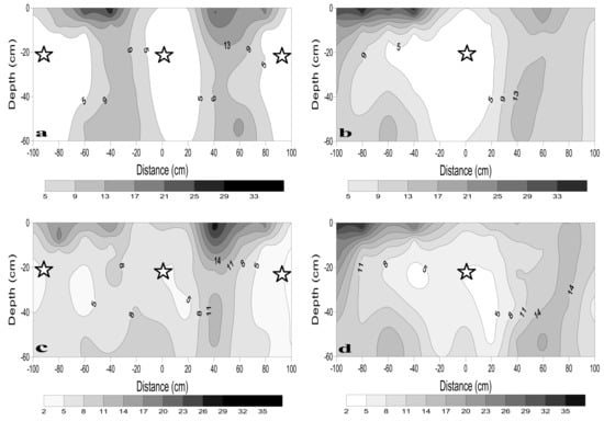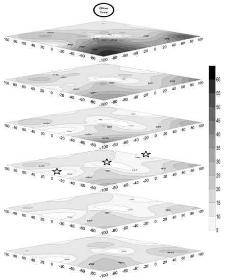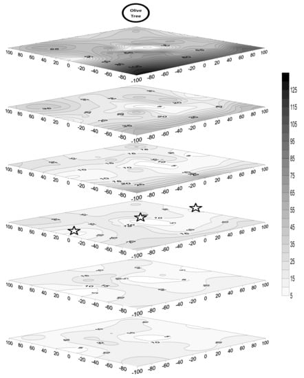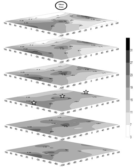The three dimensional visualization (Figure 6) shows an entire 2 m2 view for the spatial WC distribution at six individual depths (Table 2). It is clearly illustrated that down to 30 cm (the three top layers), the dryer zone prevails toward the tree line compared to the corresponding locations, away from the tree line. The dryer WC zone may indicate water uptake by the active root zone [,]. The relatively low overlap between the wetting fronts of the nearby emitters is also illustrated, suggesting that in the long-term, the solute fluxes, due to convection, dispersion, and diffusion might have reached the wetting front of individual emitter and accumulated at this location. Consequently, in the long-term, higher salinity can be expected between emitters and perpendicular to the emitter.