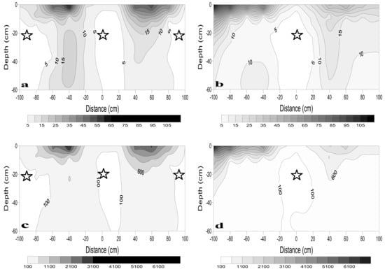 Electrical conductivity (dS m−1) distribution (a) along the drip line, (b) perpendicular to the drip line, and soil chloride (mg L−1) distribution (c) along the drip line and (d) perpendicular to the drip line. The black and white stars indicate the location of the drippers.