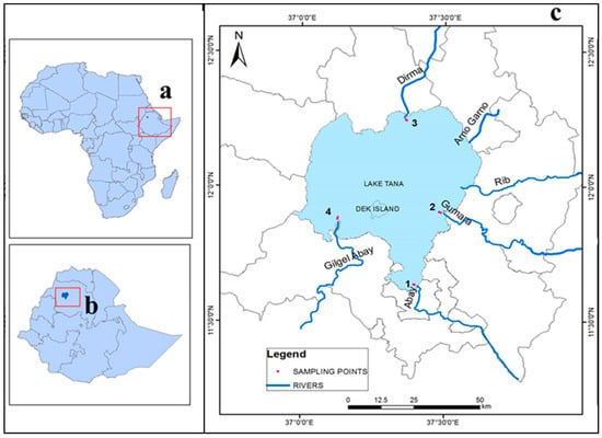 (a,b) red rectangles indicate the location of Ethiopia and Lake Tana in the Maps of Africa and Ethiopia, respectively. (c): Map of the Lake Tana watershed showing the study sites; pink dots are sampling sites and the numbers are the name of sites (see in the text).