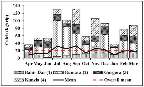 Distribution of Labeobarbus spp. catch (kg)/trip (overall catch, y-axis) as a function of time (month, x-axis) from experimental fisheries during the period of May 2016 to April 2017. The solid black line indicates the mean of the catch each month, while the dotted red line is the overall mean of the yearly catch.