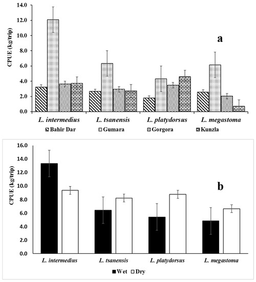 The distribution of CPUE of the four dominant Labeobarbus spp. across the four study sites (a) and wet and dry seasons (b) in Lake Tana during 2016–2017.