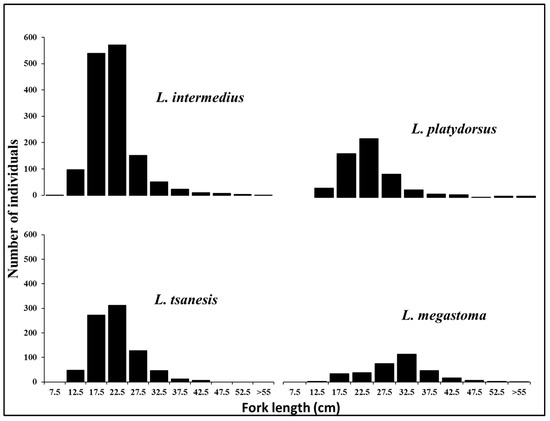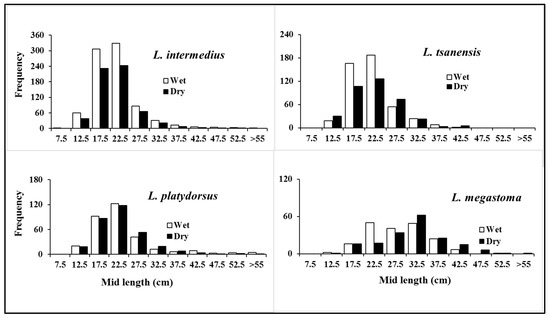 Length-frequency distribution of L. intermedius, L. tsanensis, L. platydorsus, and L. megastoma during the wet and dry seasons.